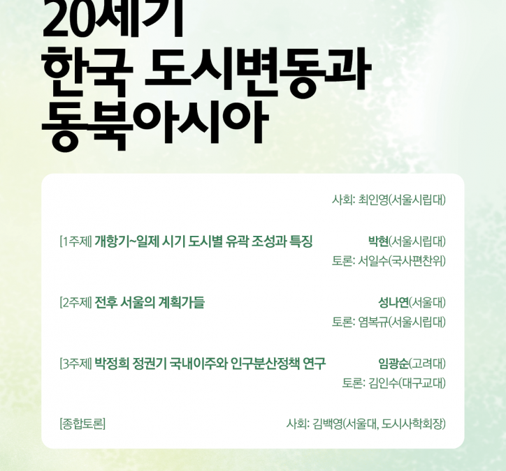 이번 도시사학회의 춘계학술대회는 서울대 아시아연구소 동북아시아센터와 공동 주최하며 <20세기 한국 도시변동과 동북아시아>를 테마로 삼는다. 동북아시아라는 역사적-지정학적 공간에서 식민지기와 포스트식민지기를 거쳐 온 한국 도시변동의 역사적 연속성과 변동의 국면별 양상의 특징을 살피되, 국내적 차원을 넘어서 동북아시아적 지평과 시각을 도입하려 시도한다.