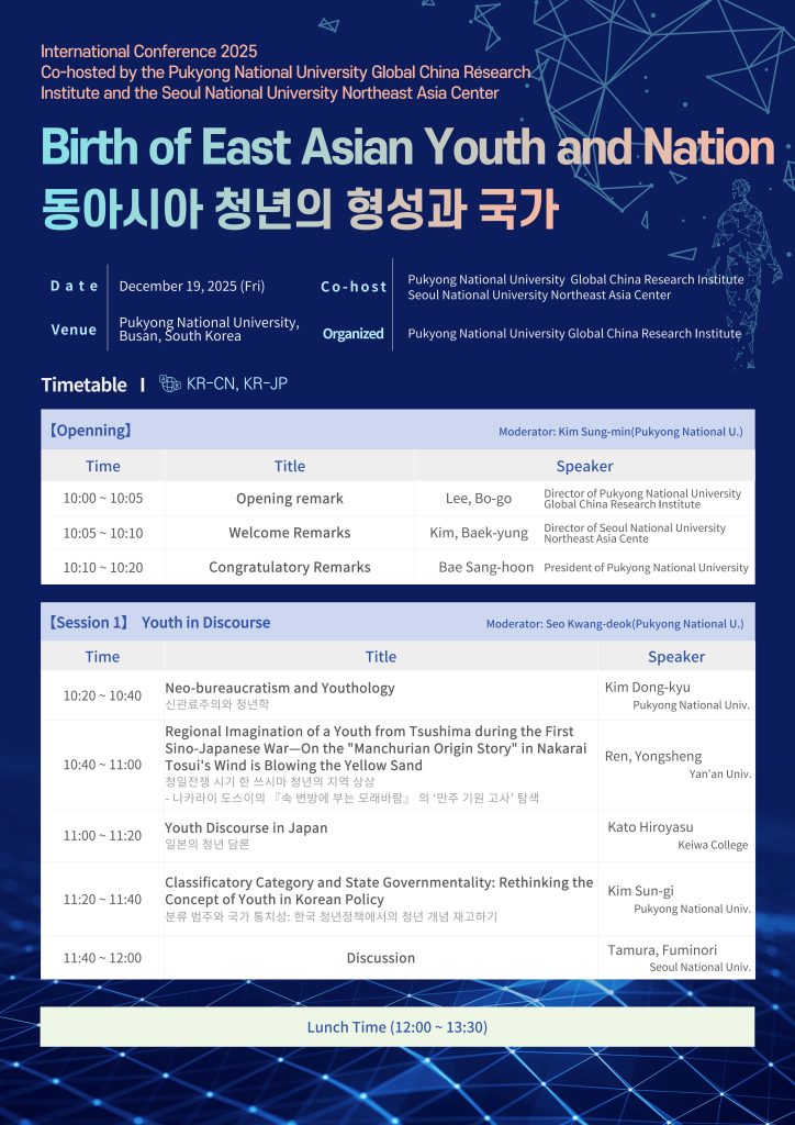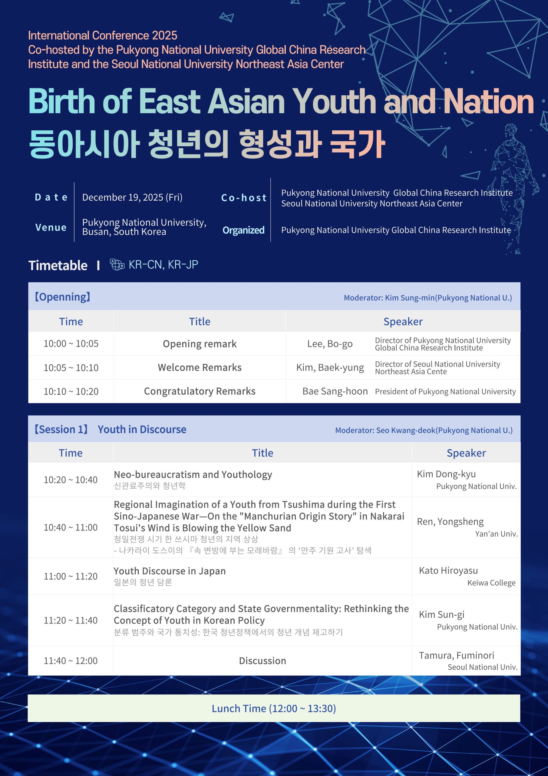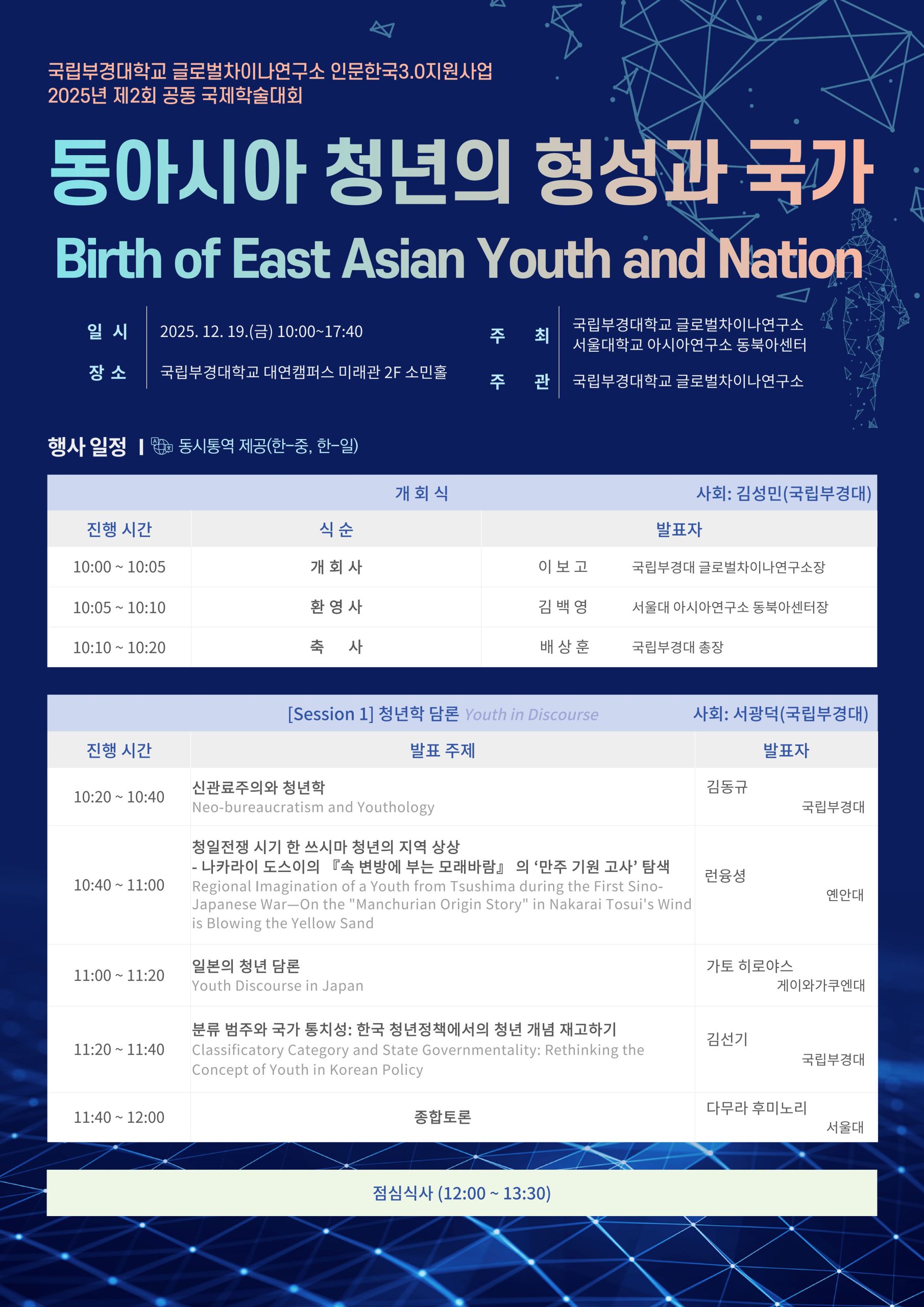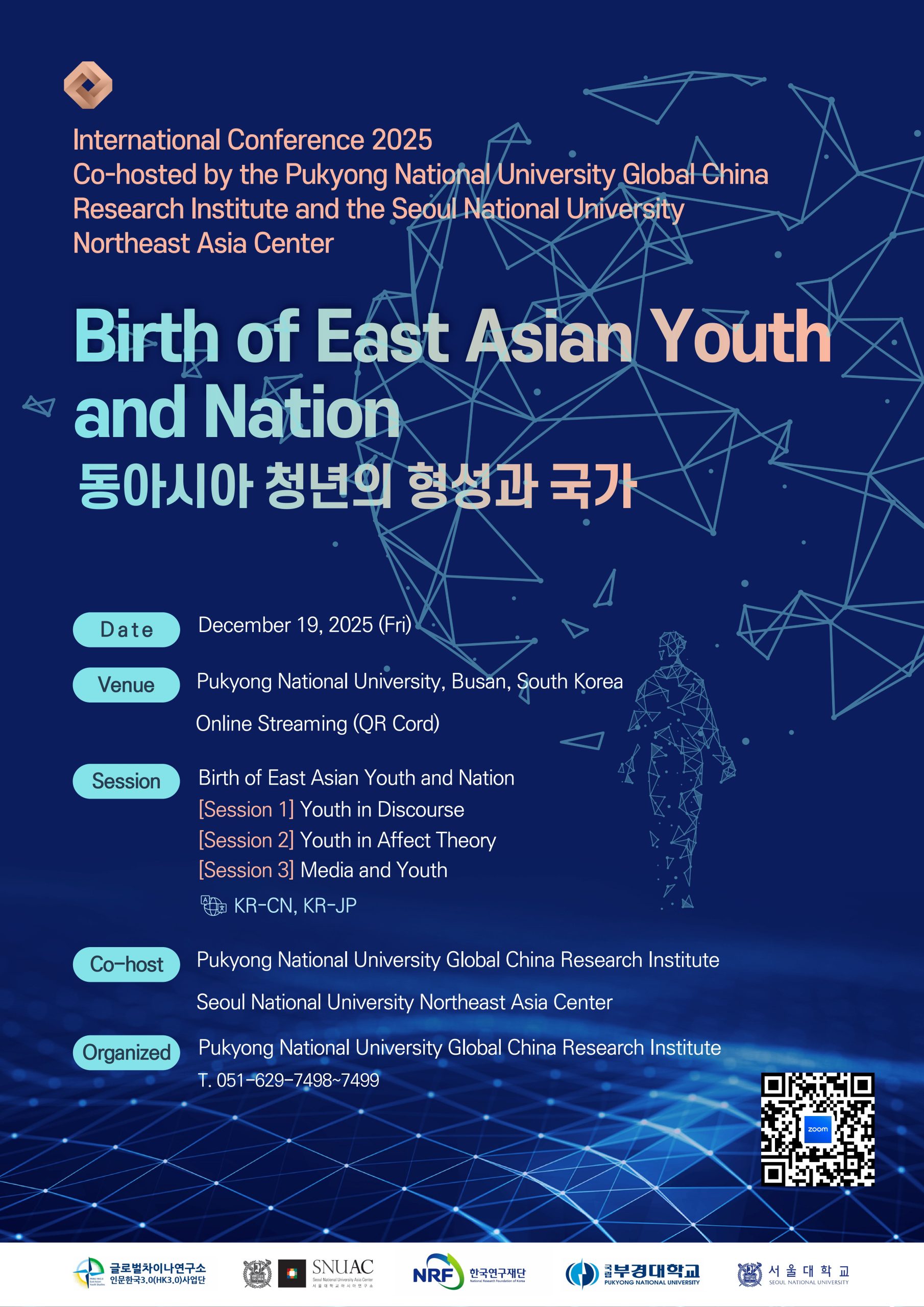 서울대 아시아연구소 동북아시아센터와 국립부경대학교 글로벌차이나연구소가 공동 주최하는 <동아시아 청년의 형성과 국가> 국제학술회의가 12월 19일 국립부경대학교 대연캠퍼스 미래관 2층 소민홀에서 개최된다.
